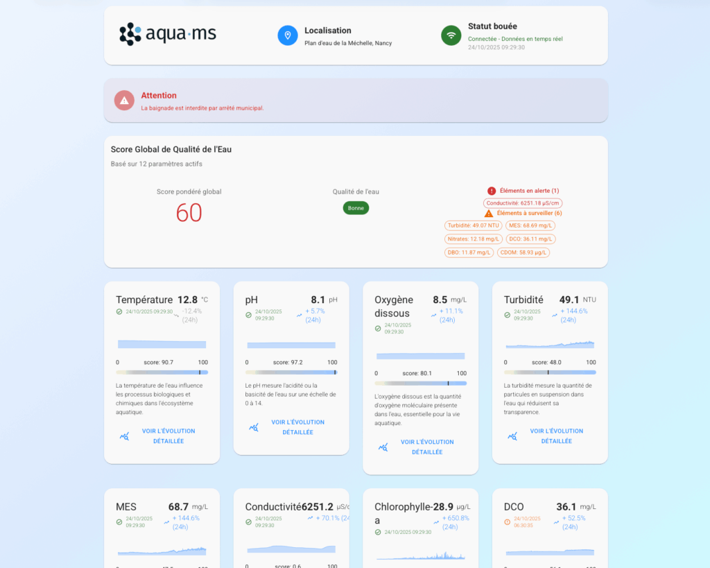 Seit August 2025 wird in Nancy eine vernetzte Messboje namens ÉCHO erprobt, die eine kontinuierliche Überwachung der Wasserqualität des Flusses Meurthe ermöglicht. Das System wurde vom lokal ansässigen Unternehmen AquaMS entwickelt (https://www.aquams.com) und ist mit einer Vielzahl hochpräziser Sensoren von TriOS Mess- und Datentechnik ausgestattet, die zentrale physikalisch-chemische Parameter erfassen. Dazu gehören: